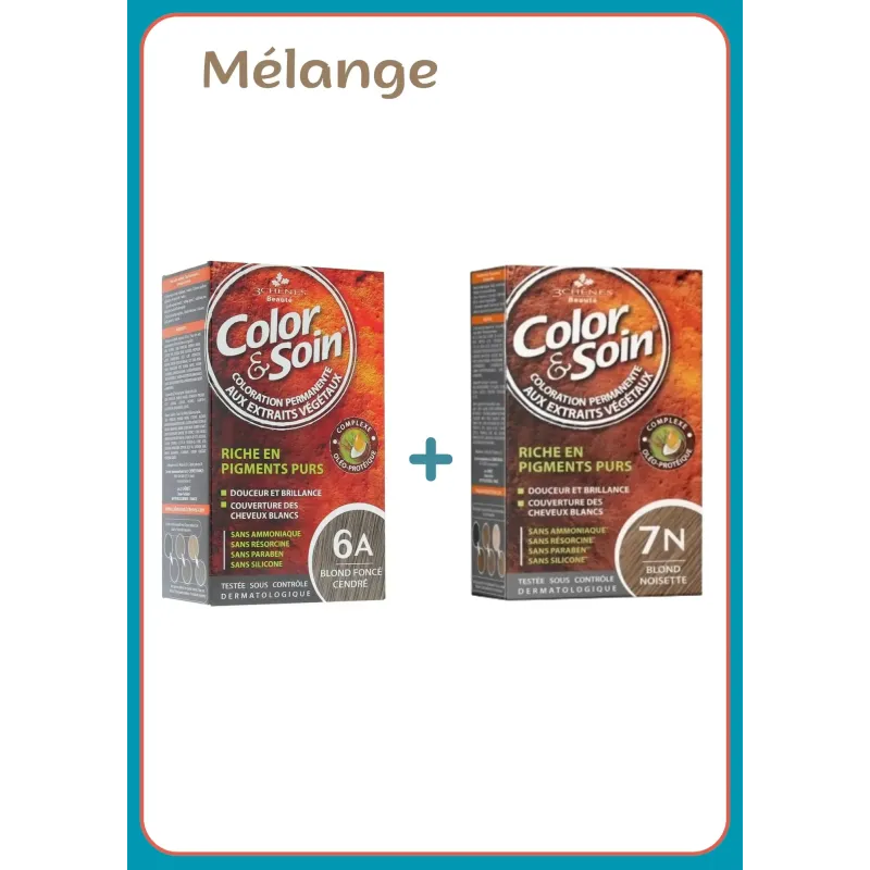 Ce mélange est une combinaison stratégique entre une base neutre et un reflet correcteur. Le 7N (Blond Moyen) sert de base de lumière pour éviter que la couleur ne devienne trop sombre, tandis que le 6A (Blond Foncé Cendré) vient apporter de la profondeur et surtout du "froid". Le résultat final se situe entre les deux hauteurs de ton, créant une nuance riche, élégante et surtout sans reflets roux.