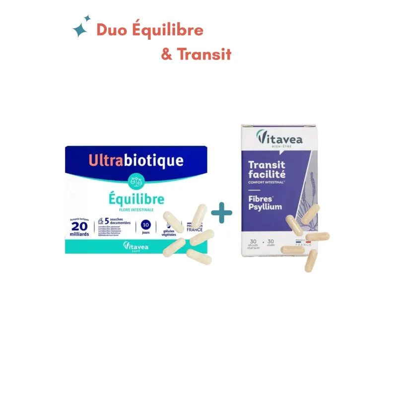 Ce duo expert de la marque Vitavea offre une approche globale pour la santé digestive en combinant deux actions complémentaires. D'un côté, l'Ultrabiotique apporte des ferments lactiques essentiels pour repeupler la flore intestinale, tandis que le complément Transit Facilité utilise le Psyllium pour réguler le flux naturel. Ensemble, ils travaillent en synergie pour apaiser le système digestif, éliminer l'inconfort et restaurer une régularité durable.