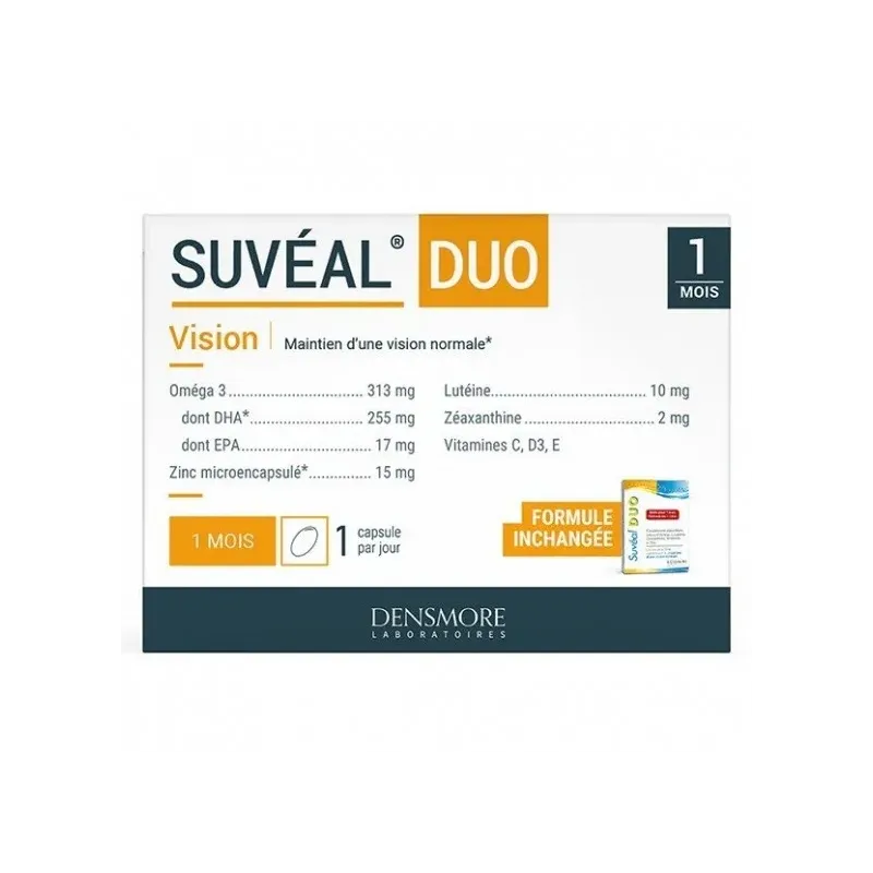 SUVEAL DUO est un complément alimentaire de haute technicité conçu pour préserver le capital vision et soutenir la fonction visuelle normale. Sa formule experte associe des antioxydants puissants, des vitamines et des oligo-éléments essentiels qui agissent en synergie pour protéger les cellules de l'œil contre le stress oxydatif. Ce complexe nutritionnel est particulièrement recommandé pour aider à maintenir une vue saine face au vieillissement oculaire et aux agressions quotidiennes comme la lumière bleue des écrans. 👁️