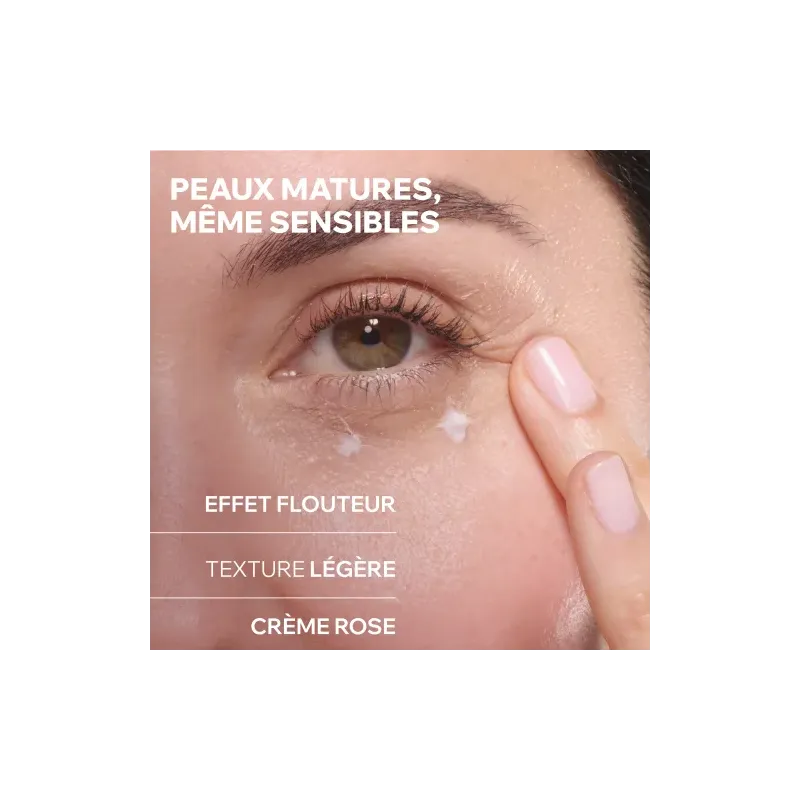 Adapté pour le contour des yeux des peaux matures, même sensibles. Indiqué en cas de perte de densité, rides profondes, paupières relâchées et manque d'éclat du regard.