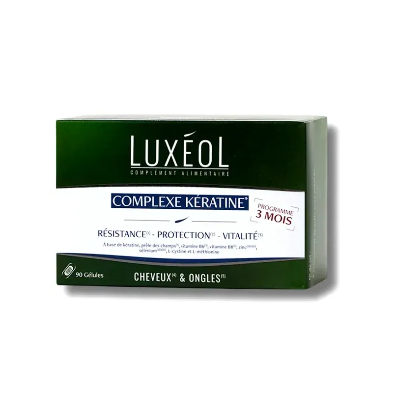 Luxéol Cheveux Complexe Kératine est un complément alimentaire de haute performance conçu pour une cure intensive de 3 mois. Ce complexe unique associe la kératine, constituant principal du cheveu, à des extraits végétaux, des vitamines et des minéraux essentiels. Il agit de l'intérieur pour reconstruire la structure capillaire, redonner de l'éclat et renforcer la vitalité des cheveux fatigués, cassants ou dévitalisés. Son format économique de 90 gélules permet de couvrir l'intégralité d'un cycle de renouvellement capillaire pour des résultats durables.