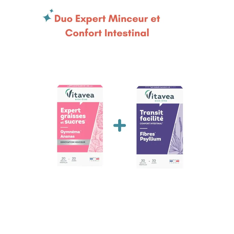 Le Pack Vitavea Expert Minceur et Confort Intestinal est une solution complète conçue pour accompagner votre programme de perte de poids tout en prenant soin de votre équilibre digestif. Ce duo synergique combine l'action ciblée de l'Expert Graisses et Sucres (Gymnéma et Ananas) pour limiter le stockage calorique, avec le Transit Facilité (Fibres de Psyllium) pour assurer une élimination naturelle et efficace. C’est l’allié idéal pour affiner la silhouette tout en évitant les sensations de lourdeur et les ballonnements.