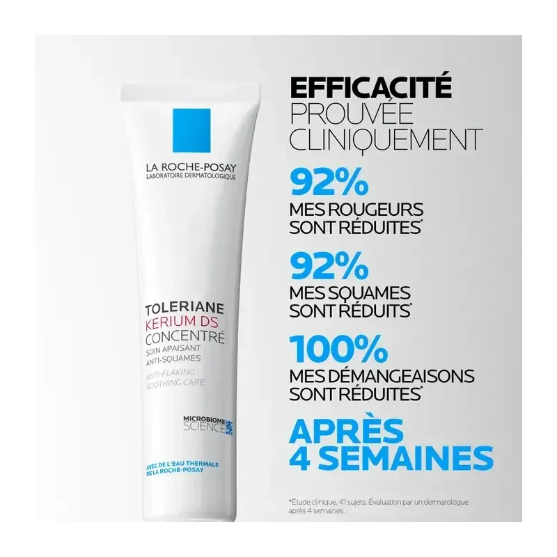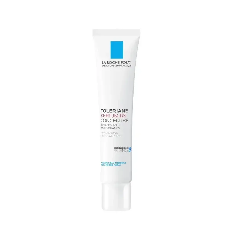 La Roche-Posay Toleriane Kerium DS Concentré (40 ml) est un soin visage quotidien hydratant et apaisant, spécifiquement formulé pour les peaux sensibles, sujettes à la dermatite séborrhéique et aux peaux sébo-squameuses (zones de rougeurs et de squames, notamment sur le nez, le front et les sourcils). Ce concentré innovant agit sur le déséquilibre du microbiome cutané pour une efficacité anti-squames et anti-rechute.
