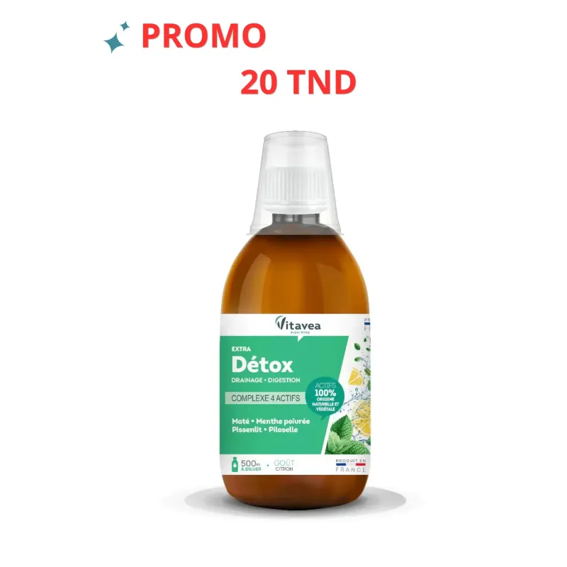VITAVEA EXTRA DÉTOX DRAINEUR CITRON 500ML est une solution buvable conçue pour accompagner les programmes de détoxification et de minceur. Sa formule est une synergie d'extraits de plantes, notamment le pissenlit, le thé vert et le bouleau, reconnues pour leurs propriétés diurétiques et dépuratives. Ce produit est un allié précieux pour les personnes qui souffrent de rétention d'eau, de gonflements ou qui souhaitent nettoyer leur organisme pour un bien-être général et une silhouette affinée.