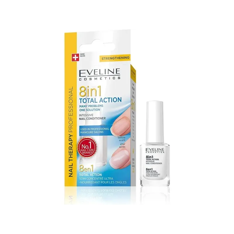 Le Total Action 8in1 Soin Concentré d'Eveline Cosmetics est un traitement révolutionnaire pour les ongles qui durcit, répare, protège et fait briller les ongles fragiles et abîmés, leur redonnant force et vitalité.