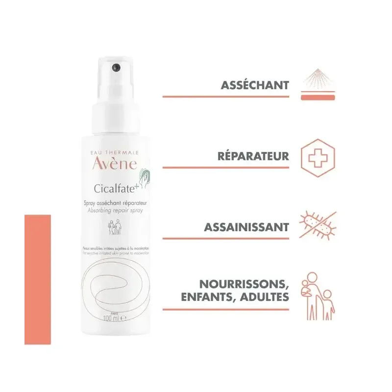 L'Avène Cicalfate+ Spray Asséchant Réparateur 100ml est un soin purifiant et apaisant pour les peaux irritées sujettes à macération (visage, corps, siège). Grâce à ses poudres absorbantes, au [C+-Restore]™ réparateur et aux sulfates de cuivre et zinc assainissants, il assèche, favorise la réparation et limite la prolifération bactérienne, le tout apaisé par l'Eau Thermale d'Avène. Son format spray est pratique, hygiénique et non tachant.